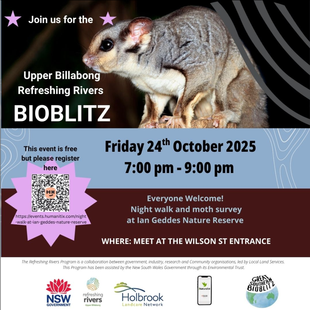 We have some fantastic events coming up for the Upper Billabong Refreshing Rivers BioBlitz! These are all free events and everyone is welcome!