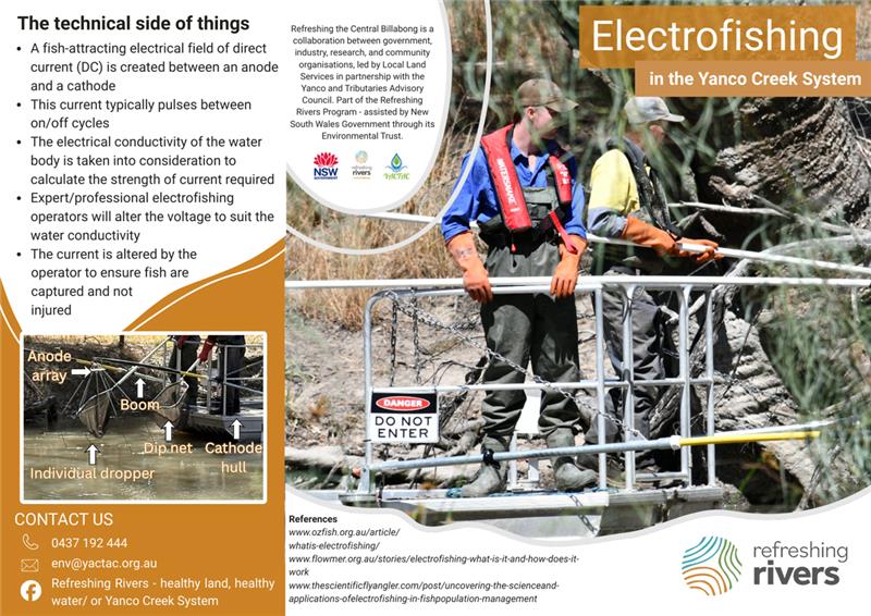 Ever heard about electrofishing and wondered what it is or how it works? As part of the Refreshing Rivers Program, Yanco Creek and Tributaries Advisory Council have developed an informative and handy brochure to help you learn all about!