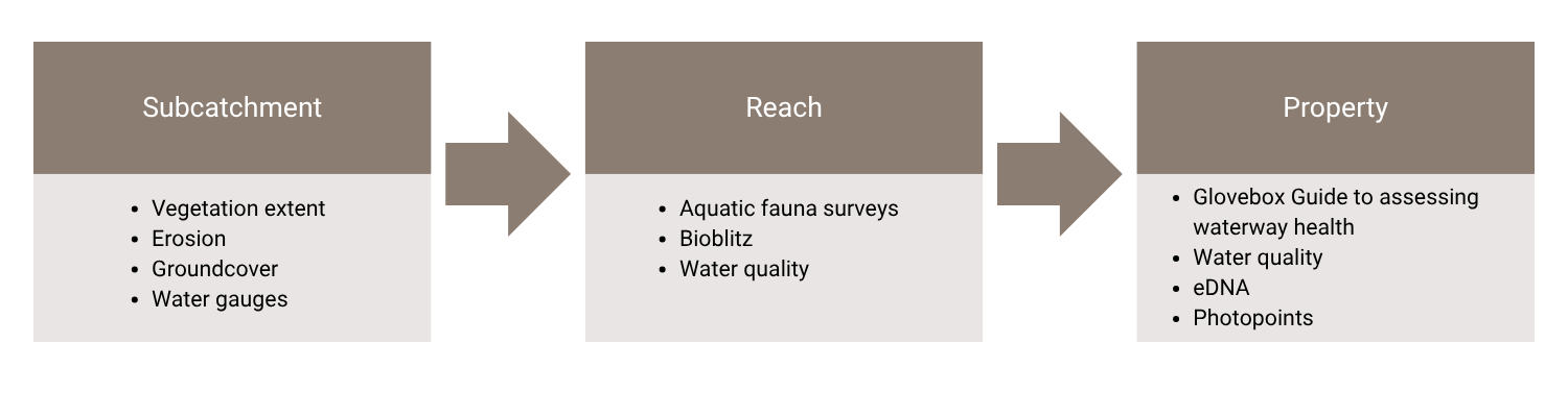 Water quality will be measured at the property, reach and sub-catchment scales.